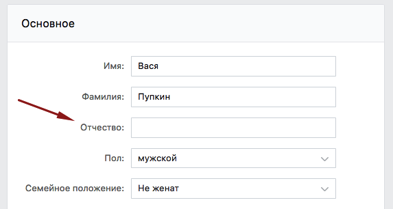 Добавляется поле для указания отчества страницы.Поле появляется на странице редактирования основной информации: https://vk.com/edit