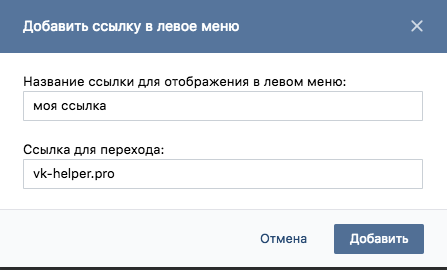 1. Скачайте и установите расширение VK Helper в браузер. Если расширение уже установлено, то необходимо обновить расширение до последней версии.2. В настройках расширения VK Helper, в разделе "Для быстрой работы" включите функцию "Добавление своих ссылок в левое меню".